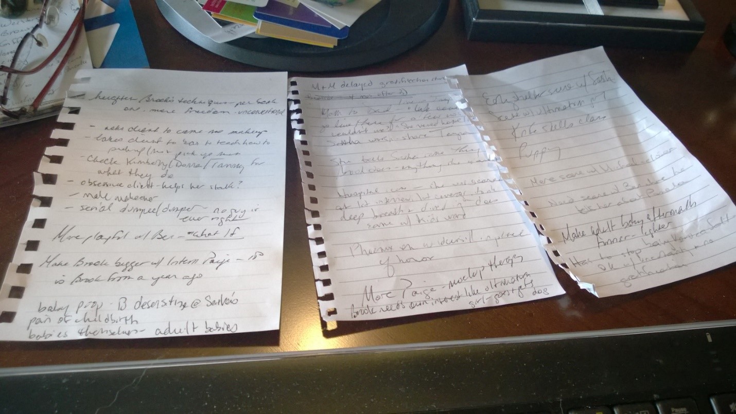 Once I finally find the story and wind up with a draft I call “finished” (yes, I’m laughing too…), the real work begins. My editing process starts with what I call “triage” (with a tip of the hat to master editor Sol Stein for the concept). This entails reading the “finished” (hahaha! it’s funny every time!) manuscript like a reader—without analyzing or trying to edit, just making very brief notes of where the story still needs work. That looks like this: