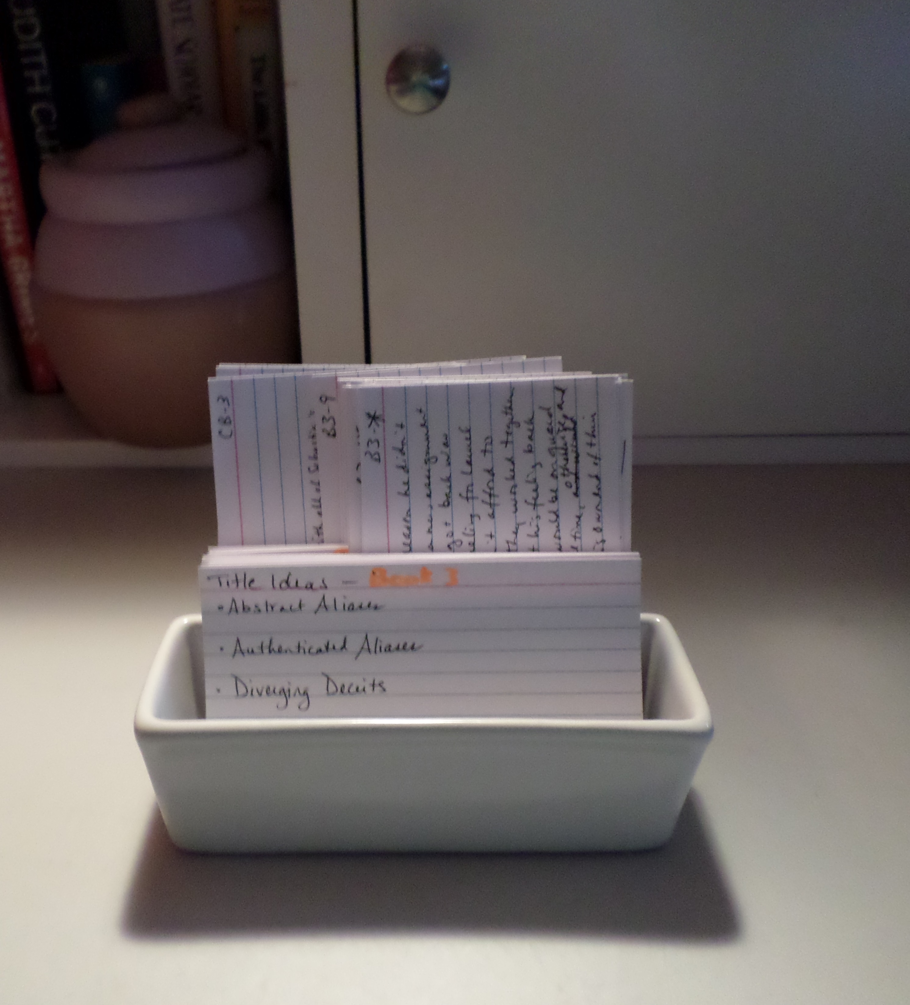 Since I have tie-ins to art, art history, European locations, gala events, and all means of transportation—oh, and escape techniques when main characters run afoul of bad guys—I do a LOT of research. This little tray of notecards stays on my desk at all times. Each day, I scatter notecards around my desk and in groupings on the floor, but at night they’re tucked safely back into their ceramic tray. The little paper soldiers seen here are what’s left of Book #3 notecards after I’d already ‘processed’ a third. I tuck all reference material—especially the notecards—away every night because even my husband wants to know more about these books than I’m ready to reveal. No one gets a sneak peek.